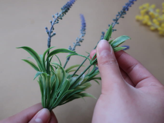 春のお花として、ミモザとラベンダーを用意しましたが、黄色と紫の組み合わせのバランスがなかなか決まりません……ラベンダーについていた葉を取りたかったので、造花をばらしていろいろ調整しています。