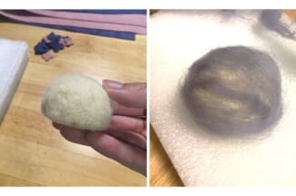 花の隙間からベースの色が見えてしまうことがあるので、羊毛フェルトでフェルティングベースの周りを覆います。花の色と似た色の羊毛フェルトを選びましょう。