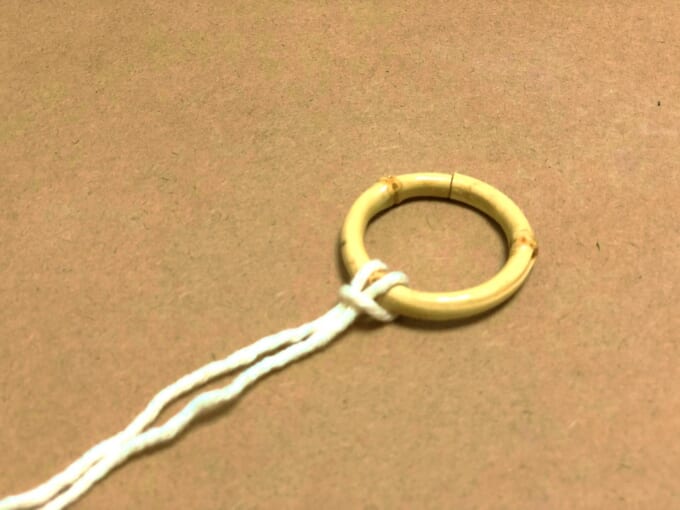 【ステップ2】 お好みの輪っかのパーツに、下の図のようにひもを通して結ぶ