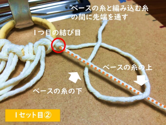 - ② ①を結び終えたら、下の図のとおり再度編み込むほうの糸をベースの糸にからめるようにして結びます。