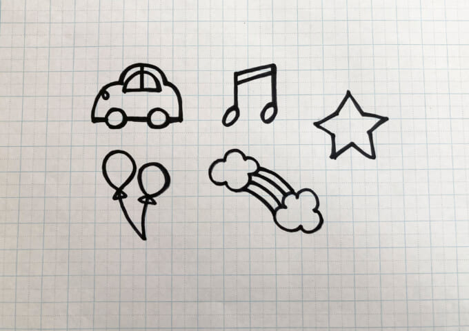 ガーランドに吊るすモチーフのデザインはこちらの5種類。まず、紙にワイヤーで成形していくための下絵を描きます。下絵はすべての線をつなげて書きましょう。