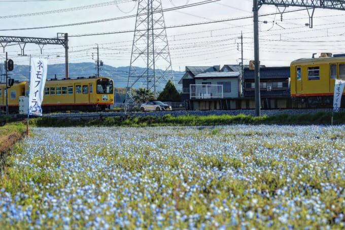 多くの鉄道ファンが訪れる三重県いなべ市の大泉駅。春になるとネモフィラが青空に染まるように、さわやかなブルーの花が一面を覆いつくすように咲き誇ります。鮮やかな黄色の電車と、青色のネモフィラのコントラストはとても幻想的です。そんな夢のような世界に迷い込んでしまったかのように、ひょっこりと姿を見せるHONDA S660の姿が。ネモフィラのじゅうたんを横目に黄色い電車と並走しているかのようにも見える1枚です。