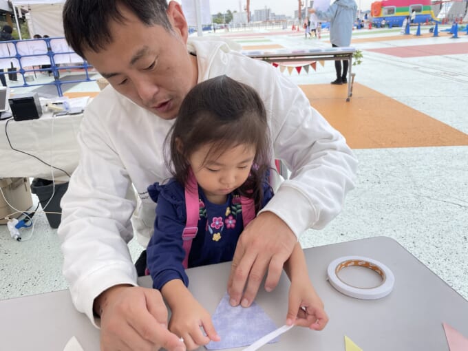 さらに完成したガーランドに、サンシャインワーフ神戸のマスコットキャラクター「わ~ふちゃん」のシールを貼って、さらにアレンジする子どもたちの姿も見受けられました。